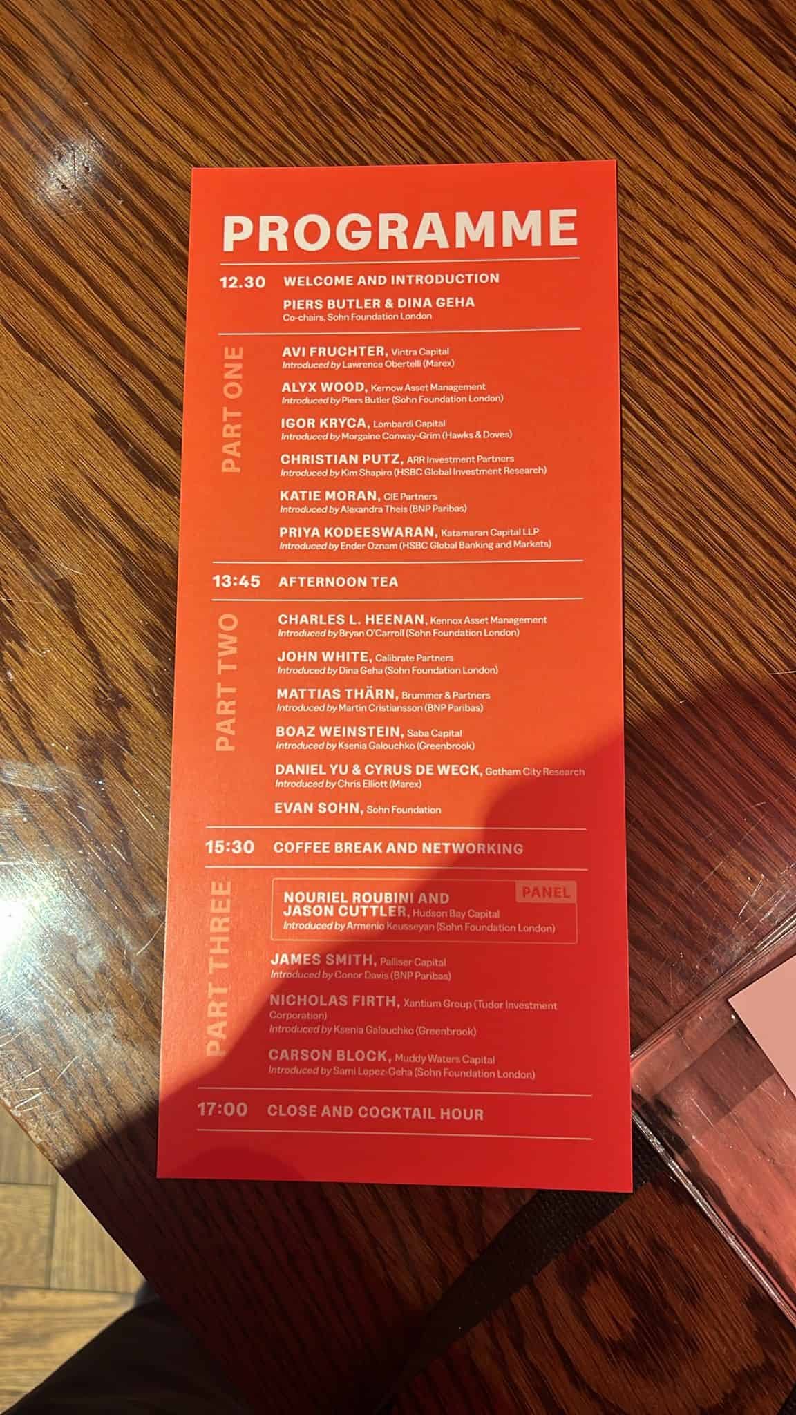 The speaker list and agenda for the 12th Annual Sohn London Investment Conference is detailed below, followed by links to each pitch.