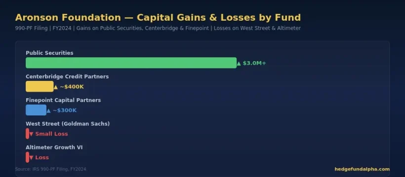 As far as capital gains and losses, the Jeffrey H and Shari L Aronson Foundation raked in over $3 million on publicly traded securities. The foundation also sold some holdings in the West Street Global Growth Partners Offshore fund at a small loss. The West Street fund is a private equity growth-expansion fund operated by Goldman Sachs.