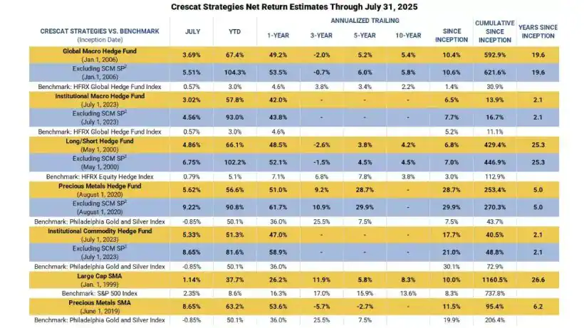 Performance data represents past performance, and past performance does not guarantee future results. Performance data is subject to revision following each monthly reconciliation and/or annual audit. Performance figures presented Excluding SCM SP represent the fund’s net returns calculated without the impact of the San Cristobal Mining, Inc. side pocket that was designated on July 1st, 2024. The side pocket includes a private equity asset that is not available to new investors in the funds on or after July 1, 2024. Excluding these assets provides a clearer view of the performance to investors coming into the funds after that date. New investors cannot participate in the SCM Side Pocket and will not share in its potential gains or losses. Investors should consider both the overall performance and the performance excluding the side pocket when evaluating the fund’s returns. Net returns reflect the performance of an investor who invested from inception and is eligible to participate in new issues and side pocket investments. Net returns reflect the reinvestment of dividends and earnings and the deduction of all expenses and fees (including the highest management fee and incentive allocation charged, where applicable). An actual client’s results may vary due to the timing of capital transactions, high watermarks, and performance. Performance figures for the SMA composites have been restated and may differ from performance previously presented in Crescat materials for these strategies. Please see important disclosures regarding this table below.