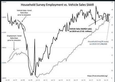 US employment reached a new high July 2019 with vehicle sales holding at current levels. Temp Help has stalled but Real Retail Sales and Personal Income continue to rise. This looks quite positive in the face of the current round of pessimism which has been present since Jan 2018.