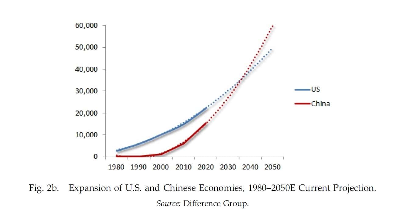 In 2000, China’s economy was barely a tenth of the U.S. GDP. But after China became a member of the World Trade Organization (WTO) in 2001, its export-led growth soared in the course of the 2000s, when its share of the U.S. economy more than tripled from 12 percent in 2000 to over 40 percent in 2010. The original Goldman Sachs estimate was that China would sur- pass the United States in the late 2020s (Figure 2a); and that remains the case under Xi Jinping’s leadership, assuming current secular trend lines prevail (Figure 2b).