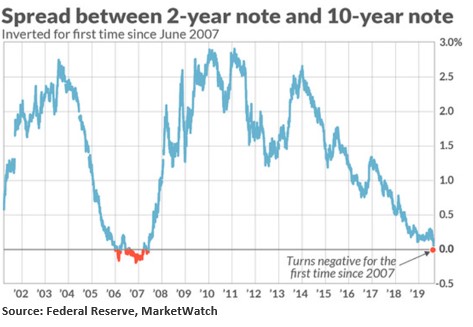 Here are some figures that might surprise you. Wall Street’s most widely watched gauge of the yield curve’s slope, the spread between the 2-year Treasury note yield and the 10-year Treasury, inverted last Wednesday morning. Historically, yield inversions have been a warning signal that the US may face an economic recession in the next 18 months.