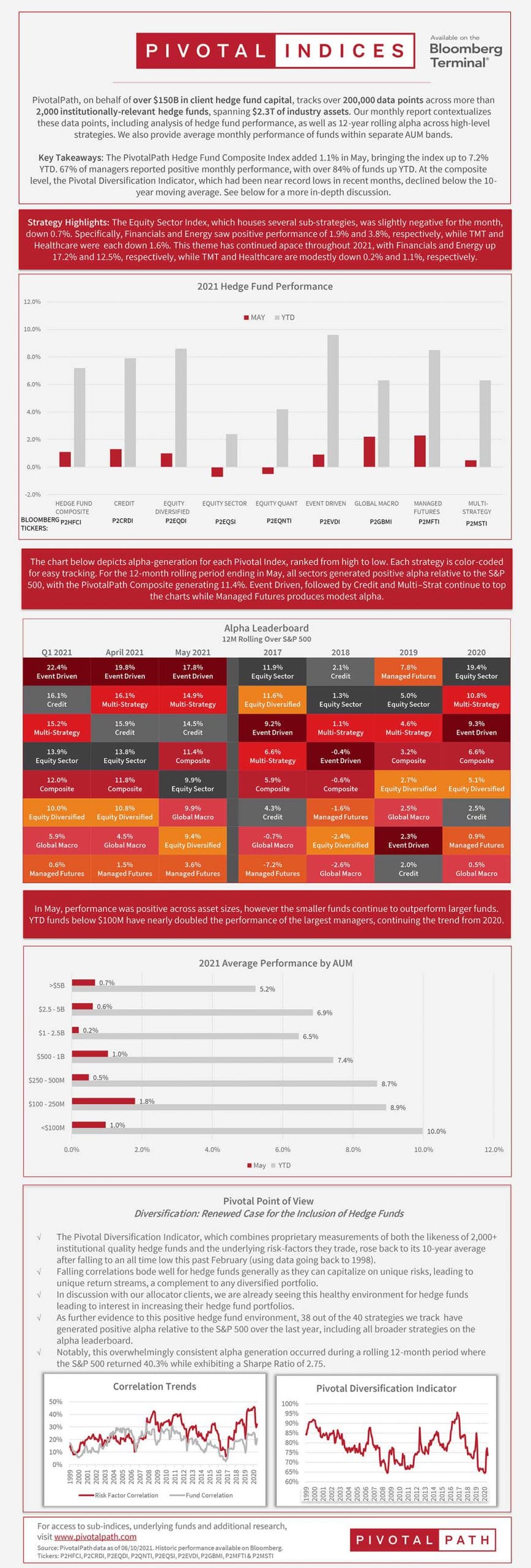 - The PivotalPath Hedge Fund Composite Index added 1.1% in May, bringing the index up to 7.2% YTD. 67% of managers reported positive monthly performance, with over 84% of funds up YTD.