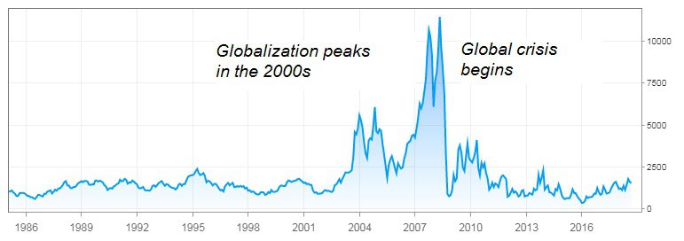 At the peak of globalization, the Baltic Dry Index (BDI) was often used as a barometer for international commodity trade. The index soared to a record high in May 2008 reaching 11,793 points. But as the financial crisis spread in the advanced West, the BDI plunged by 94% to 663 points.
