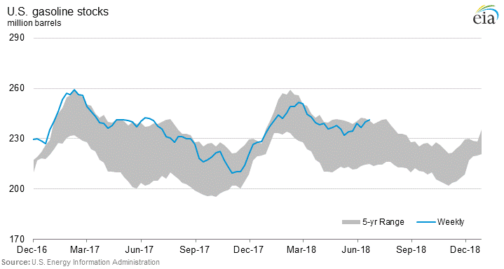 The speculators are at it again in the oil market, pushing up prices beyond the fundamentals. Sure the market is tighter than it was two years ago, but one look at gasoline inventories tells you there are more than ample petroleum supplies. In fact we have more gasoline inventories than a year ago, and we still have over 400 million barrels of oil in storage with both saudi arabia and russia now free to increase production limits going forward, something russia has been chomping at the bit to do the last year of the OPEC deal. Throw in the US Oil production near 11 million barrels per day at all time record levels, and things are not near as tight in the oil market as the oil bulls would have you believe right now.