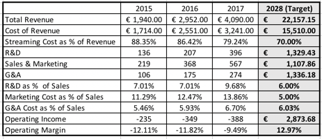 - With Reduced Content Costs: Spotify's entire value proposition rests on improved operating margins and a large portion of the improvement has to come from continuing to reduce content costs as a percent of revenues. Since Spotify pays for its content based upon song streams, those savings have to come from either paying less per stream (which is going to and should create push back from labels and artists) or finding ways to create economies of scale on this cost component. In it's defense, Spotify can point to its track record from 2015 to 2017 in reducing content costs. I assume that they can reduce content costs to 70% of revenues, while finding a way to keep artists and labels happy. That is not going to be an easy balance to maintain, especially with the top artists, as evidenced by Taylor Swift's and Jay-Z's decisions to pull their music from Spotify. (I have been told that they have reversed their decisions, but this fight is ongoing.)