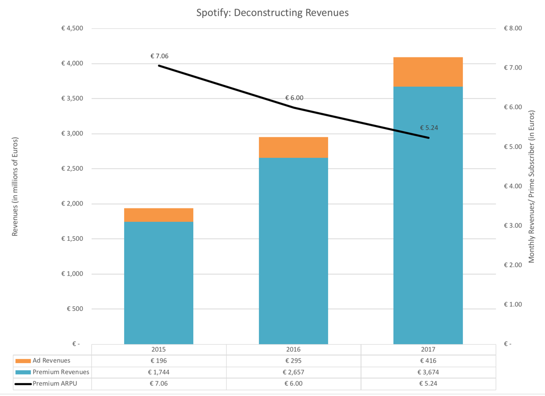 Subscription Revenue dominates Ad Revenue: Spotify's focus on improving its premium subscriptions is explained easiest by looking at the breakdown of revenues each year, where subscription revenues have accounted for 90% of revenues each year from 2015 to 2017. The one discordant note is that average revenue per premium subscriber has dropped over the same period 7.06 Euros/month to 5.24 Euros/month, a change that the company ascribes to family memberships, but a problematic trend nevertheless: