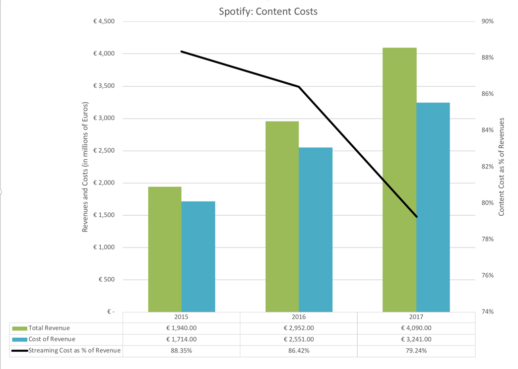Content Costs are coming down: While Spotify insists that it is not scaling back payouts to music labels and artists, the company has been able to lower its content costs as a percent of revenues each year from 88.7% of revenues in 2015 to 79.2% of revenues in 2017. In fact, Spotify has conveyed to investors that its intent is to earn gross margins of 30%-35%, implying that it sees content costs dropping to 65%-70% of revenues. There is an inherent tension here between what Spotify has to convince its investors it can do and what it tells the music industry it is doing and the tension will only intensify, after the company goes public.