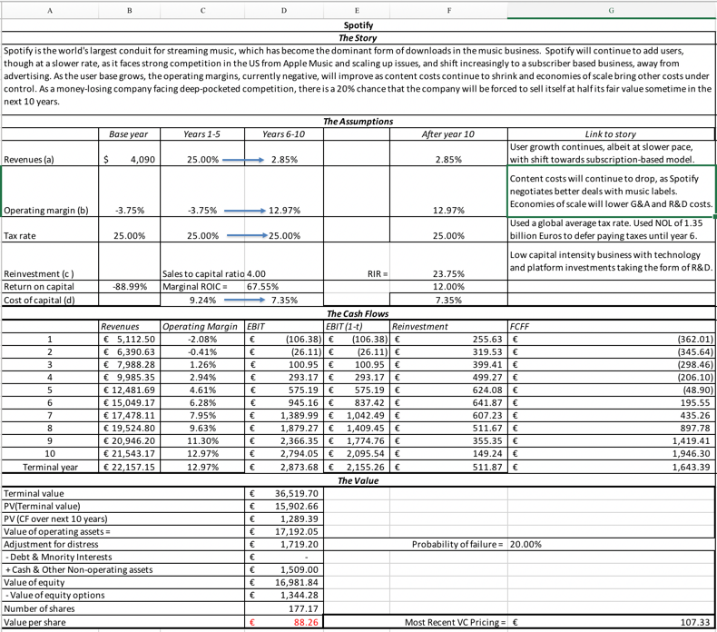 In keeping with my view that you need a story to provide a framework for you valuation inputs, and especially so for young companies, I constructed a story for Spotify with the following elements: